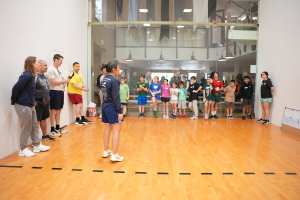The clinic focused on power serves and variations of lob serves for both first and second serves. The objective was for the collegiate athletes to have practical feedback to work on for the next ten days as they prepare for the Collegiate Nationals at the U.S. National Handball Center in St. Louis in mid-February. The clinic ended with a Q&A session with Martin, Diarmuid and Christian, which included additional technical questions on the serves as well the mental aspect of the sport and developing the non-dominant hand.